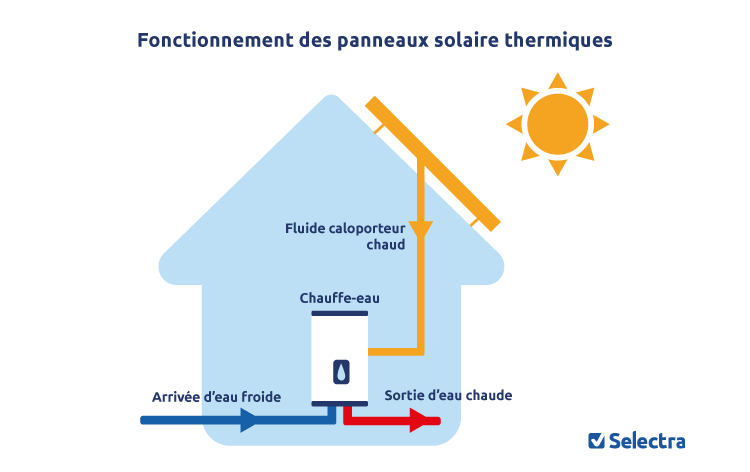 Les panneaux solaires thermiques ne produisent pas d'électricité, mais utilisent des capteurs pour convertir les rayonnements du soleil en chaleur. Celle-ci est ensuite utilisée pour chauffer l'eau courante ou alimenter un chauffage central.
