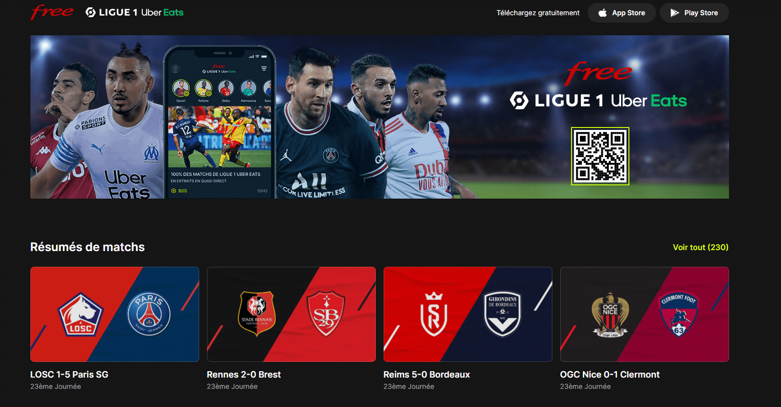 Free, par le biais d'abord d'une application étendue à un site internet, vous permettait de visionner les temps forts de la Ligue, et ce gratuitement. Ces temps forts, comme les buts, les arrêts, etc. seront visibles quasi instantanément via le site web. Vous aviez accès à un résumé complet environ 15 minutes après le coup de sifflet final. Il faut dire que depuis 2020, et jusqu'en 2024, Free détient un lot de la ligue de football professionnel lui permettant la retransmission audiovisuelle des matchs par voie numérique. De ce fait, Free proposait via son application mobile Free Ligue 1 Uber Eats de visionner les temps forts du match.